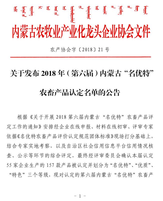 標題:關于發(fā)布2018年(第六屆)內(nèi)蒙古“名優(yōu)特”農(nóng)畜產(chǎn)品認定名單的公告