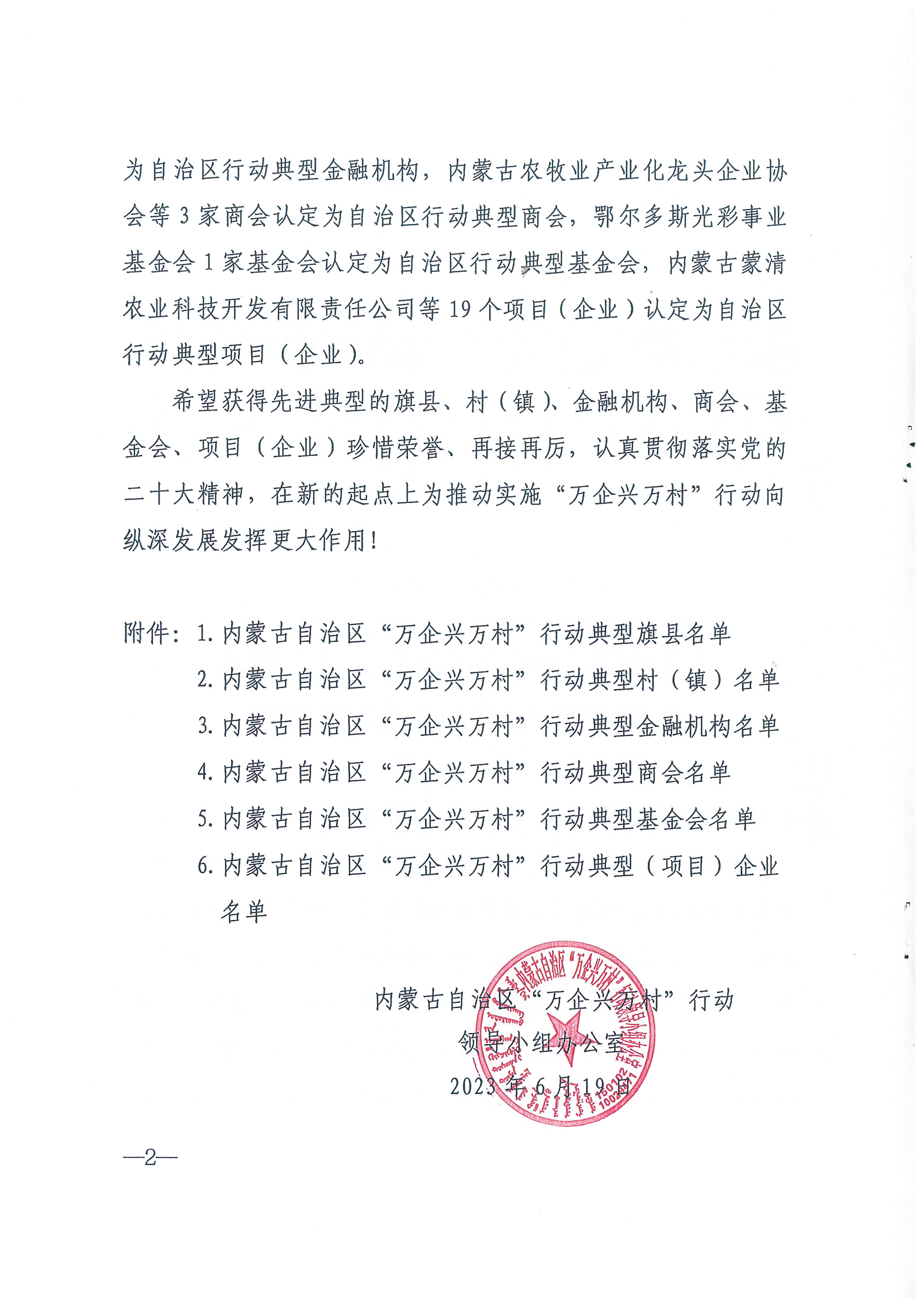 按照全國工商聯(lián)《關(guān)于做好 2023 年度全國“萬企興萬村行動先進典型選樹創(chuàng)建工作的通知》要求,經(jīng)自治區(qū)“萬企興萬村”行動領(lǐng)導(dǎo)小組研究決定,將呼和浩特市和林格爾縣等 7個旗縣認定為自治區(qū)行動典型旗縣,呼和浩特市武川縣福如東村等8個村(鄉(xiāng)、鎮(zhèn))認定為自治區(qū)行動典型村 (鄉(xiāng)、鎮(zhèn)),中國農(nóng)業(yè)銀行股份有限公司內(nèi)蒙古自治區(qū)分行等 3 家金融機構(gòu)認定為自治區(qū)行動典型金融機構(gòu),內(nèi)蒙古農(nóng)牧業(yè)產(chǎn)業(yè)化龍頭企業(yè)協(xié)會等 3 家商會認定為自治區(qū)行動典型商會,鄂爾多斯光彩事業(yè)基金會 1家基金會認定為自治區(qū)行動典型基金會,內(nèi)蒙古蒙清農(nóng)業(yè)科技開發(fā)有限責任公司等 19 個項目(企業(yè))認定為自治區(qū)行動典型項目(企業(yè))