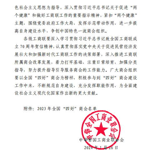 近日,中華全國工商業(yè)聯(lián)合會(huì)發(fā)布《關(guān)于認(rèn)定2023全國“四好”商會(huì)的通報(bào)》,通報(bào)指出,按照全國“四好”商會(huì)建設(shè)標(biāo)準(zhǔn),通過自下而上逐級(jí)推薦、省級(jí)工商聯(lián)審核把關(guān)和全國工商聯(lián)組織審定,認(rèn)定全聯(lián)1798家商會(huì)為2023年全國“四好”商會(huì)。其中內(nèi)蒙古自治區(qū)45家商(協(xié))會(huì)獲此殊榮,內(nèi)蒙古農(nóng)牧業(yè)產(chǎn)業(yè)化龍頭企業(yè)協(xié)會(huì)榜上有名!在此,謹(jǐn)向關(guān)心、支持協(xié)會(huì)的各位同仁表示衷心的感謝!同時(shí),對(duì)獲此殊榮的各兄弟商協(xié)會(huì)表示熱烈祝賀!