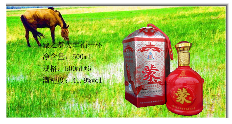 蒙酒酒業(yè)公司簡(jiǎn)介 一、 企業(yè)文化:誠(chéng)邀天下友,共圓蒙酒夢(mèng) 二、 公司簡(jiǎn)介: 蒙酒酒業(yè)有限責(zé)任公司位于中國(guó)北方著名的紅山文化圣地、中華第一龍的故鄉(xiāng)——內(nèi)蒙古赤峰市。 蒙酒酒業(yè)建在蒙古時(shí)期的“神井燒鍋”原址上,選用東北優(yōu)質(zhì)高粱、神井地下水,采用傳統(tǒng)工藝和配方,結(jié)合現(xiàn)代生物技術(shù),開發(fā)出了優(yōu)質(zhì)的原生態(tài)蒙酒,具有清澈透明...